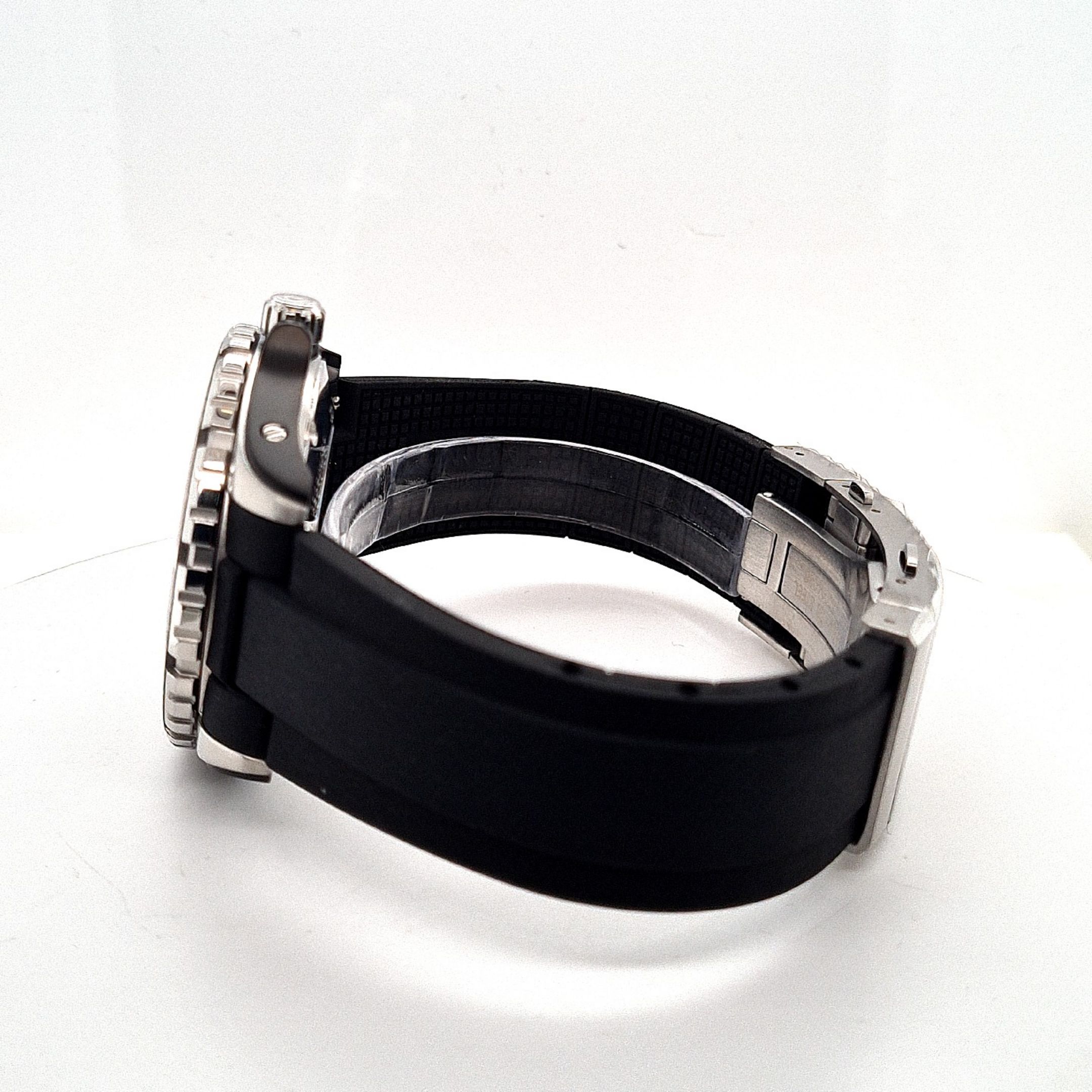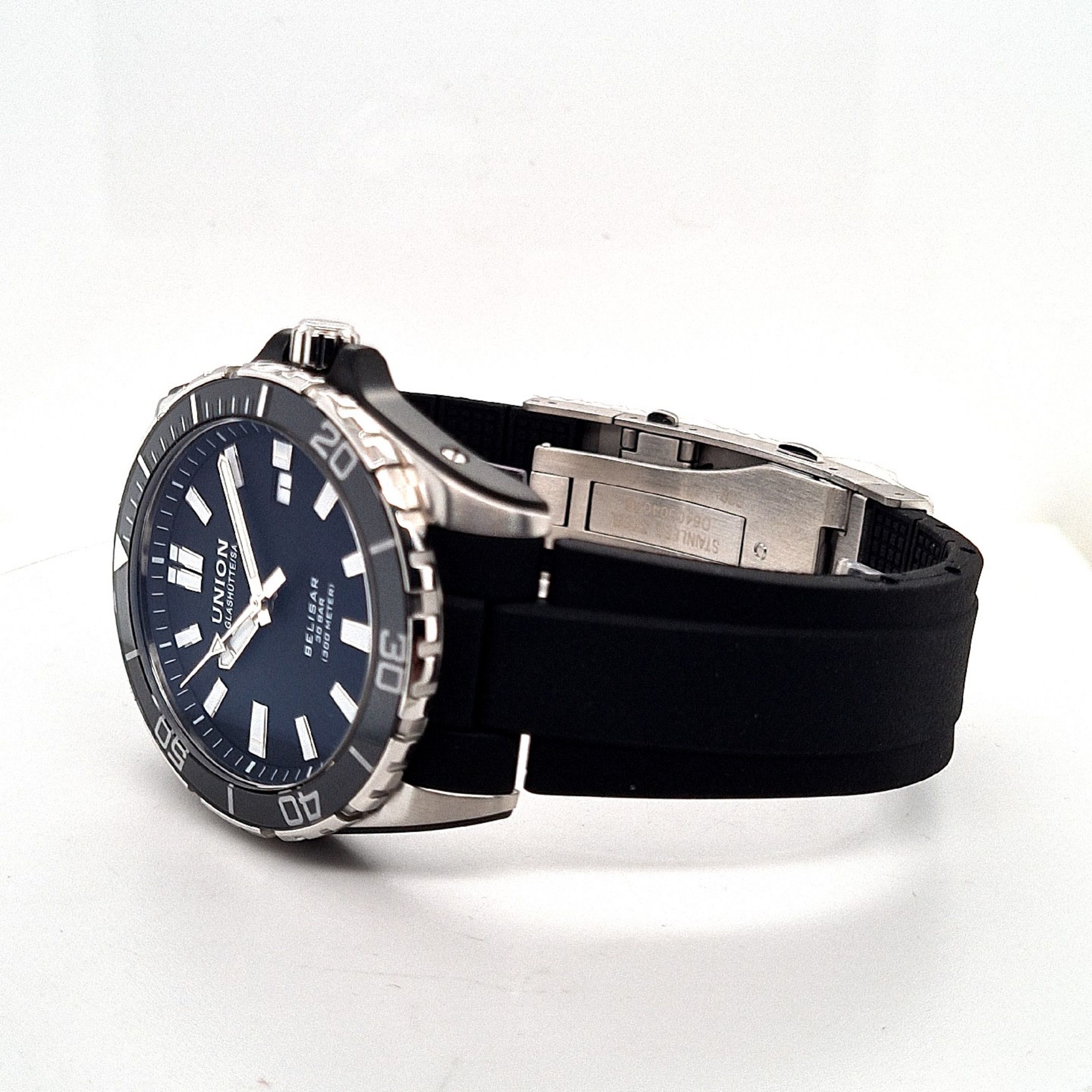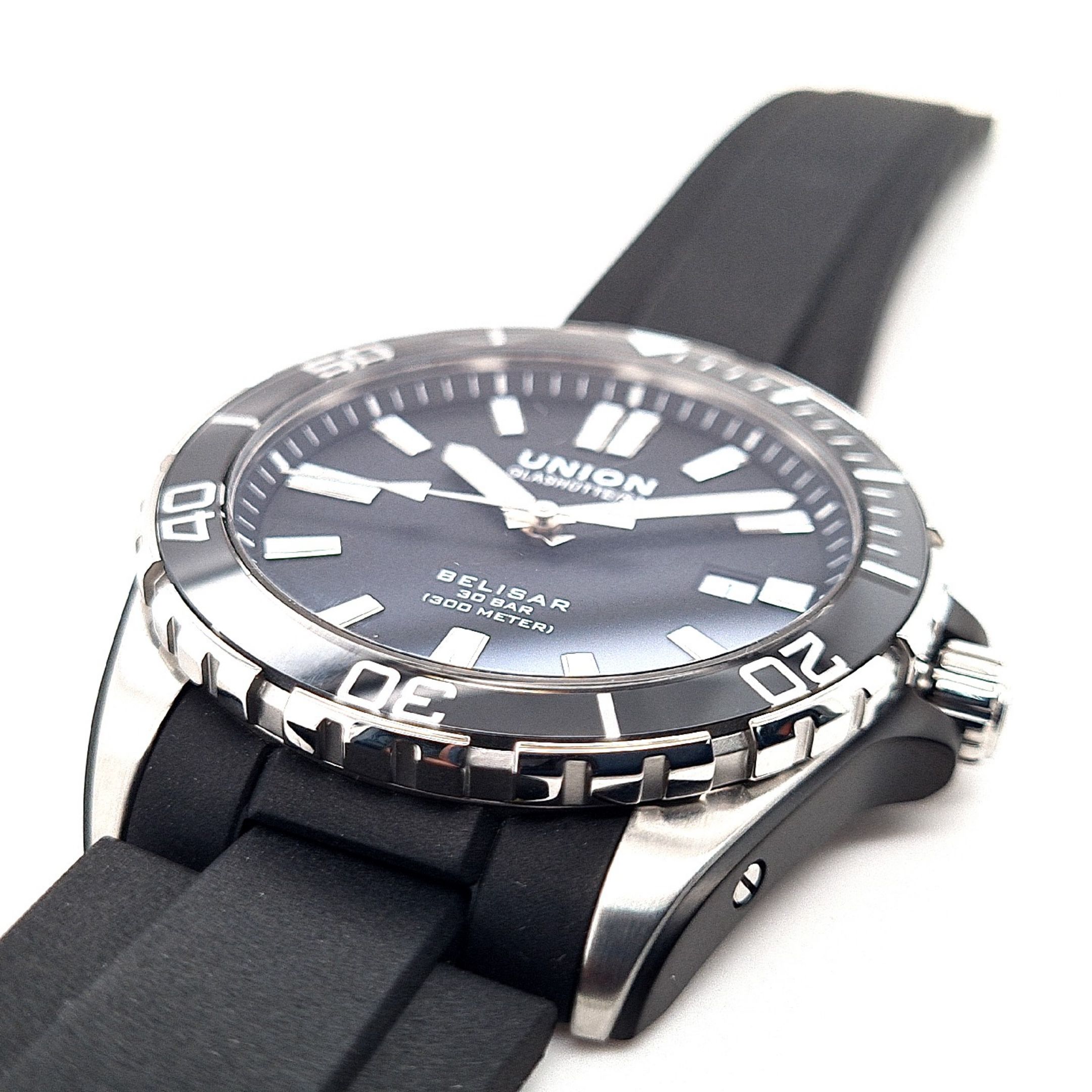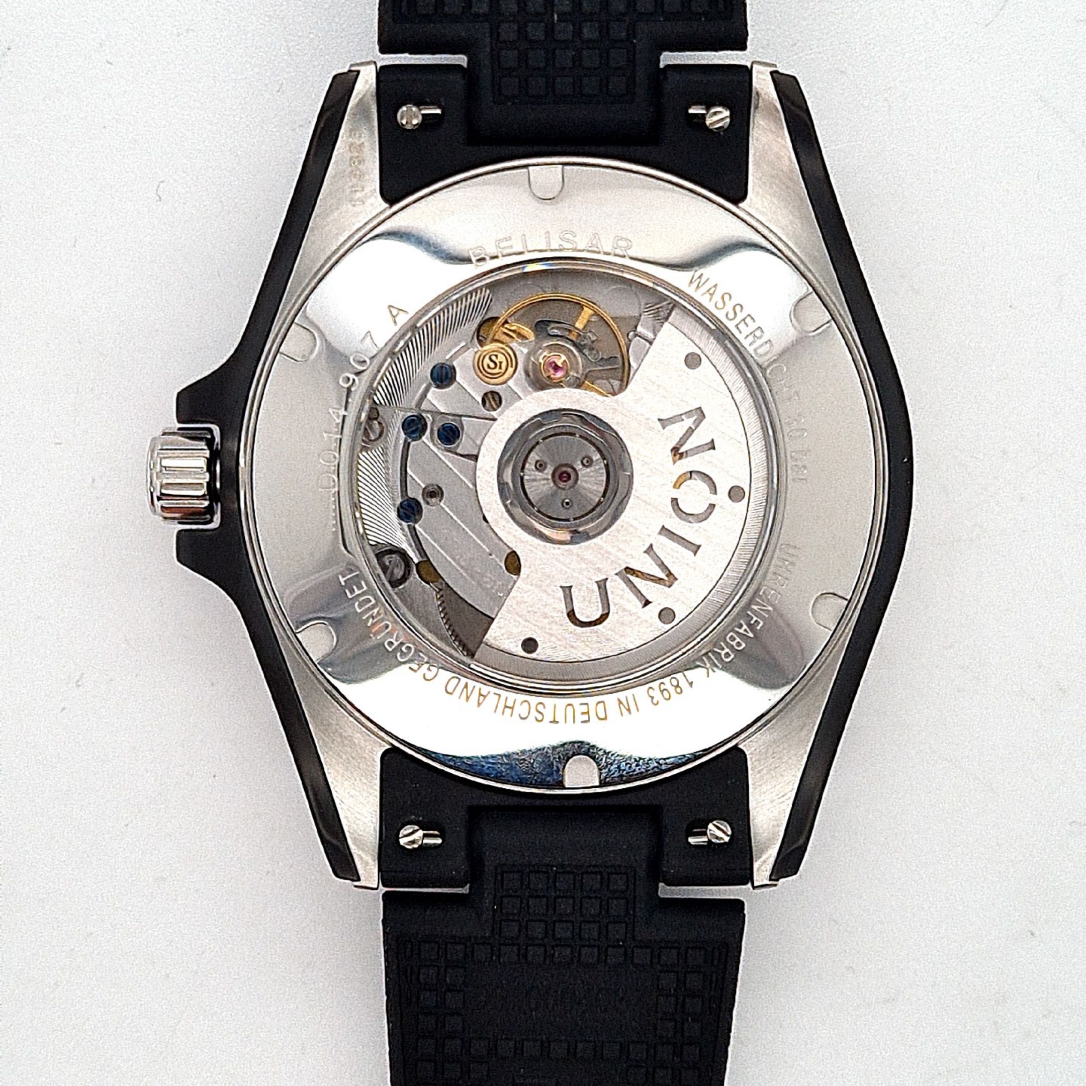 Die Belisar Datum Sport Pro setzt professionelle Akzente – egal ob über oder unter Wasser. Das markante Edelstahlgehäuse von 42 mm Durchmesser ist mit den typischen aufgeschraubten Gehäuseflanken der Belisar-Linie versehen. Die Drehlünette ist, wie das Uhrenglas selbst, aus kratzfestem Saphirglas gefertigt und daher extrem widerstandsfähig. Das gilt auch für ihre Leuchtmarkierung, die aus diesem Grund gut geschützt unter dem Glasring angebracht wurde. Eine verschraubte Krone und der verschraubte Saphirglasboden sorgen für eine Wasserdichtigkeit bis 30 bar (300 Meter). Der Sportzeitmesser weist mit dem Werk UNG-07.S1 / H3 / 3H eine Gangreserve von bis zu 60 Stunden au.